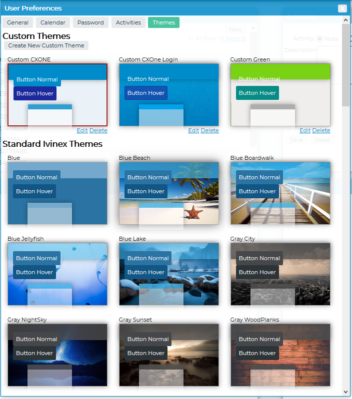 Themes allows you to change Theme by clicking on an existing Theme OR